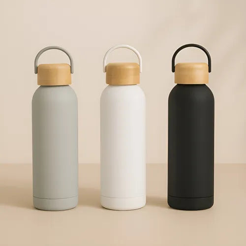 Botella deportiva de 500 cc de metal con tapa simil madera. - COLORES. blanco, negro, gris y bronce