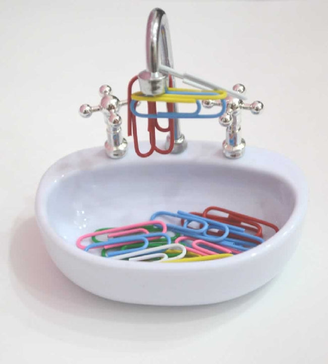 El contenedor imita el diseño de un antiguo lavabo y contiene un set de clips de alambre en diferentes colores. Puedes crear goteras colocando un clip en la boca del grifo, ya que es magnético y atrae todo tipo de objetos imantados. Medidas aproximadas: 11,5 cm x 10,2 cm