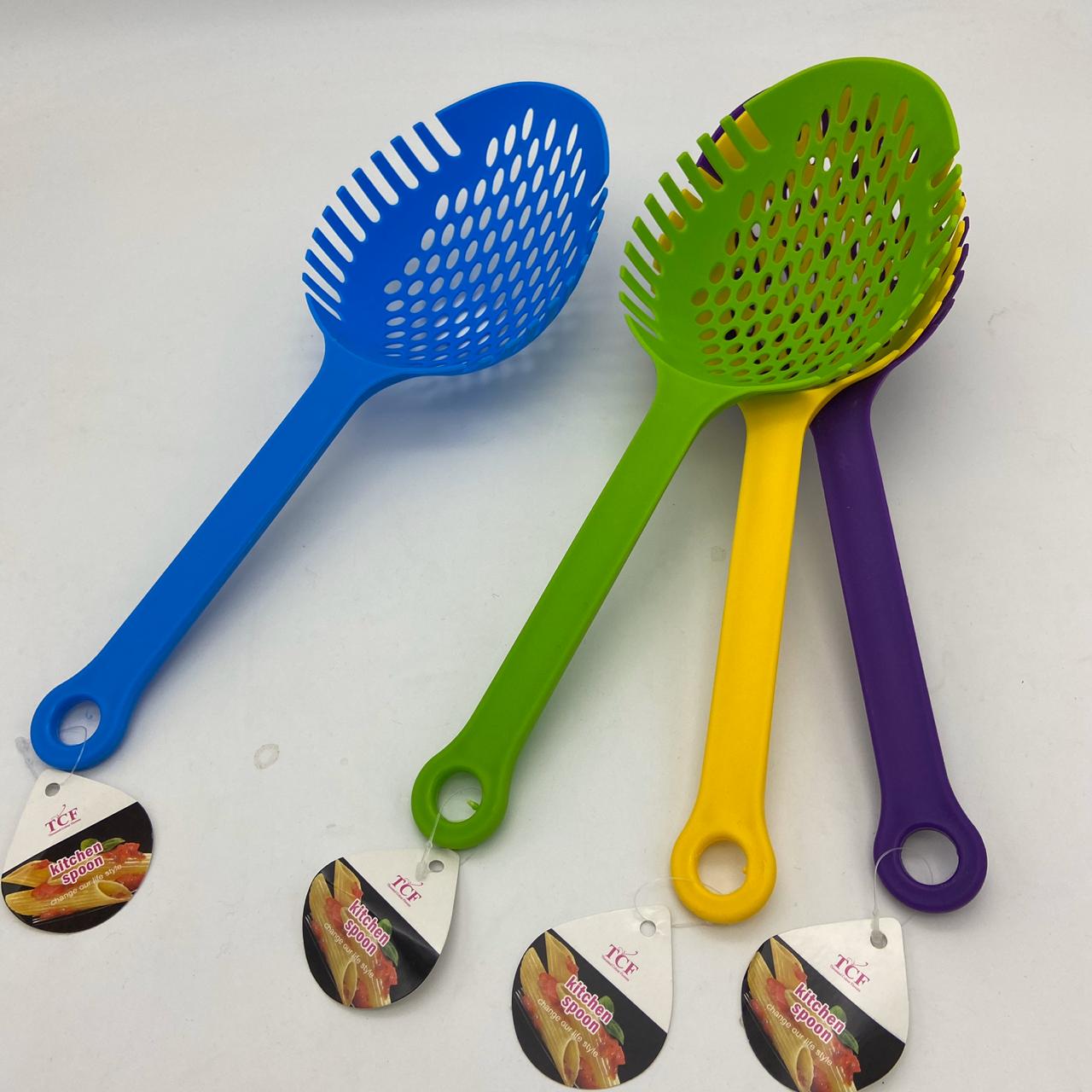 practica cuchara escurridora. Material: plástico - Medidas: 35 cm largo. colores: violeta, amarillo, verde, celeste