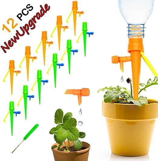 Estacas de riego por goteo. La misma permite colocar cualquier botella de PVC común con pico de 1/2. Pueden ser botellas de 500 cc hasta 2 litros. Tiene regulador de caudal del riego por goteo, puede ser lento, normal, rápido y muy rápido.