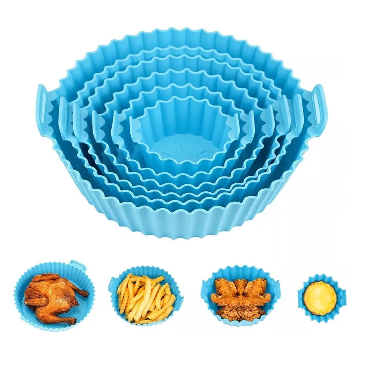 Estos moldes son accesorios diseñados para facilitar la cocción y la limpieza al usar una freidora de aire. Material: Están fabricados con silicona de grado alimenticio, lo que los hace seguros para altas temperaturas. Son antiadherentes, reutilizables, Tamaño aprox: 1: 5 x 20 x 20 cm / Cesta 2: 5 x 17 x 17 cm / Cesta 3: 4 x 15 x 15 cm / Cesta 4: 4 x 12 x 12 cm / Cesta 5: 4 x 10 x 10 cm / Cesta 6: 4 x 7 x 7 cm.