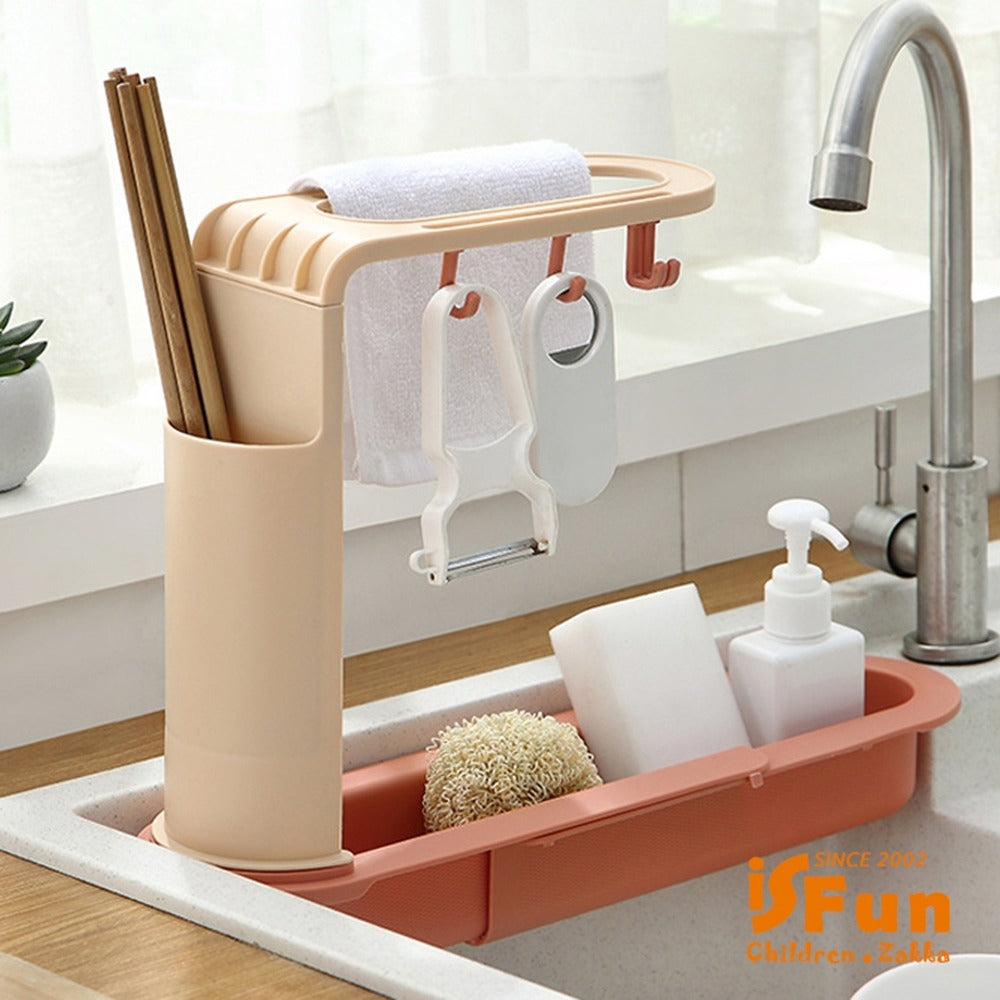 Original y completo escurridor organizador para bacha, extensible, con cuelga toalla y ganchos.