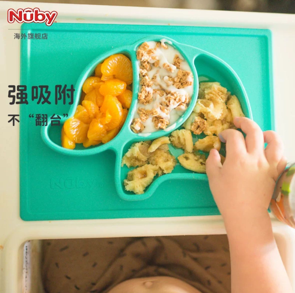 Plato de silicona resistente con divisiones, ideal para los mas chiquitos, con hermoso diseño de elefante.