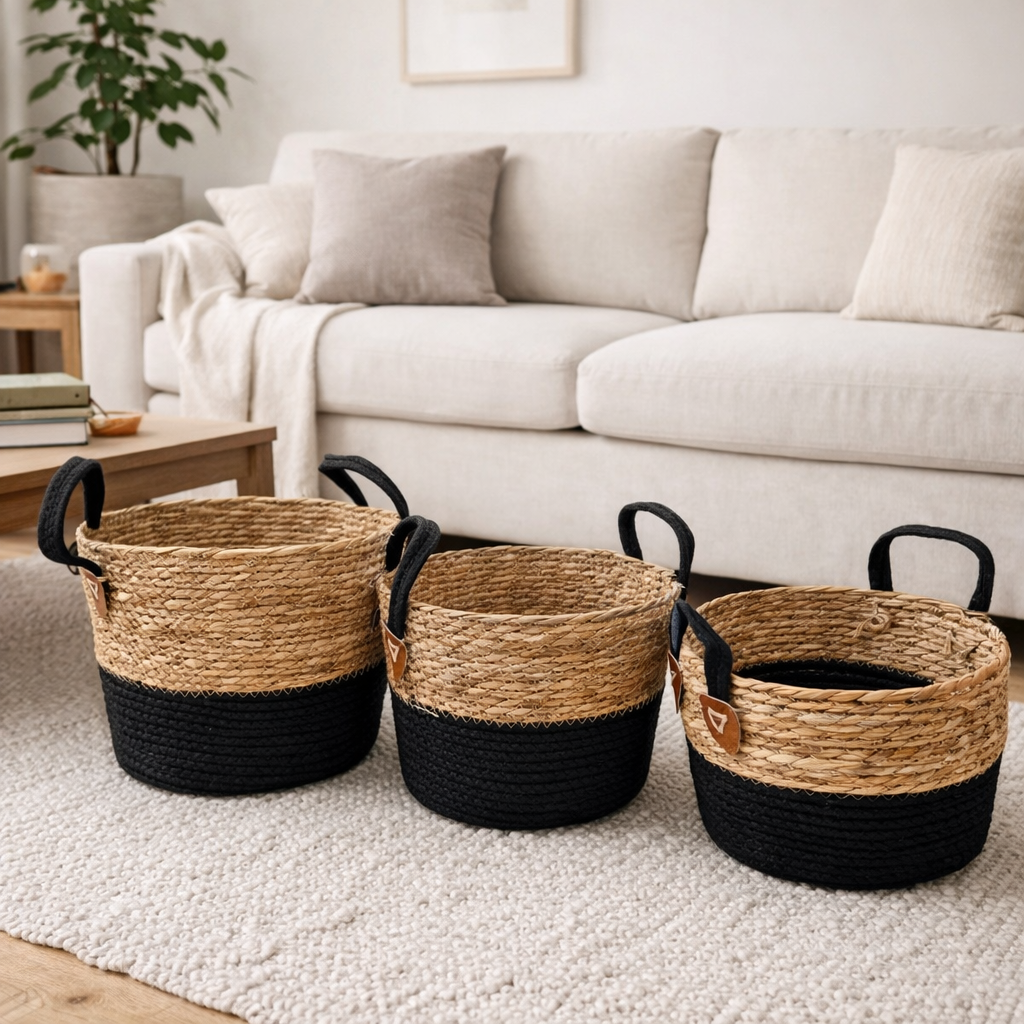 Set 3 Canastos de fibra natural y Cuerda tejida de algodón. Ideal para organización del hogar.