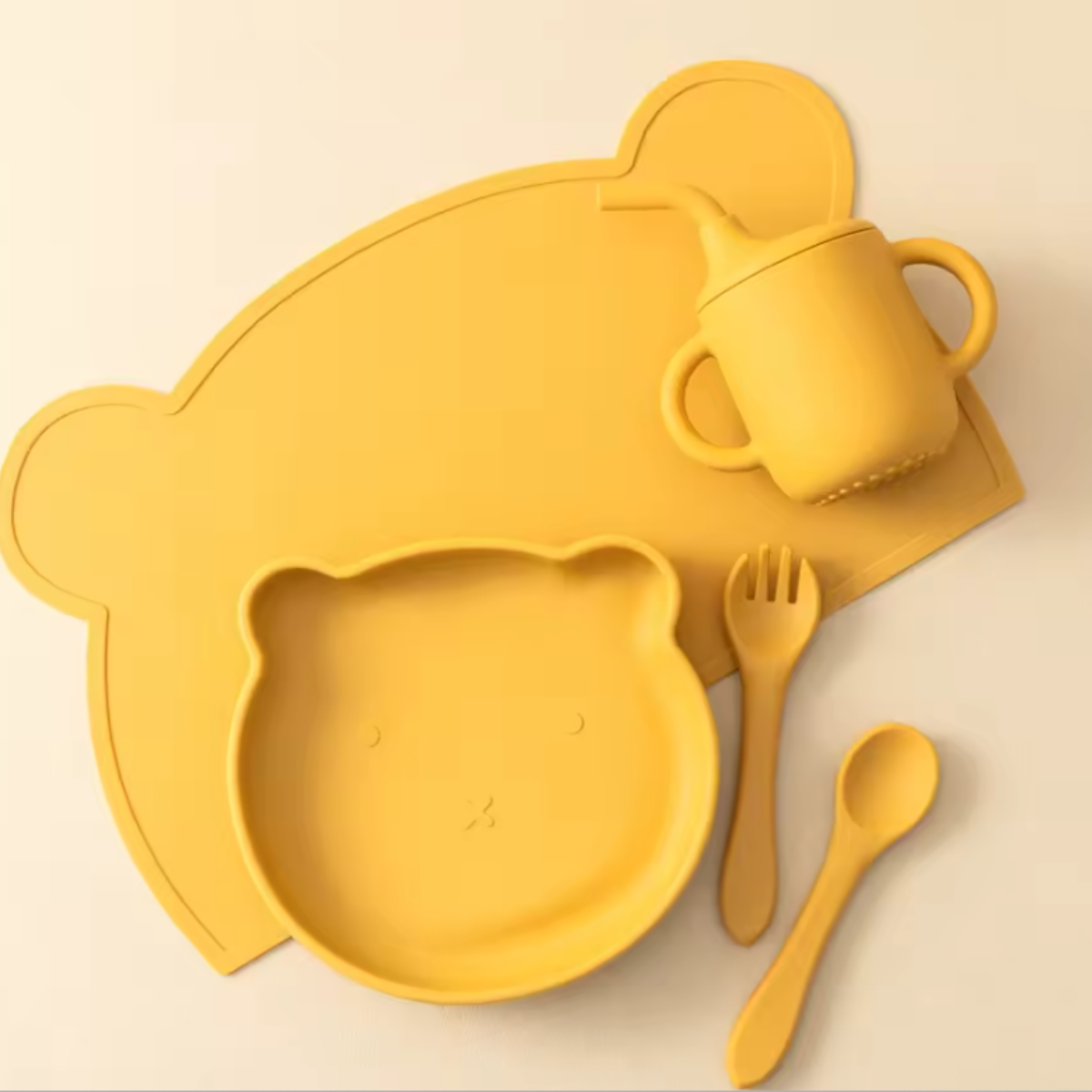 Fabricado en silicona de grado alimenticio, libre de BPA y no tóxica, seguro para bebés y niños. Incluye plato con ventosa antideslizante, taza, cuchara, tenedor e individual.