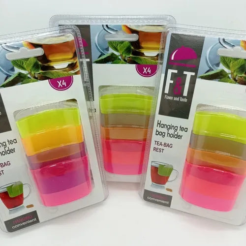 Set x4 soportes para colgar de la taza y colocar el saquito de te, Color: celeste/Amarillo/Verde/Rosa. Medidas: 5.5cm x 2.5cm x 5cm
