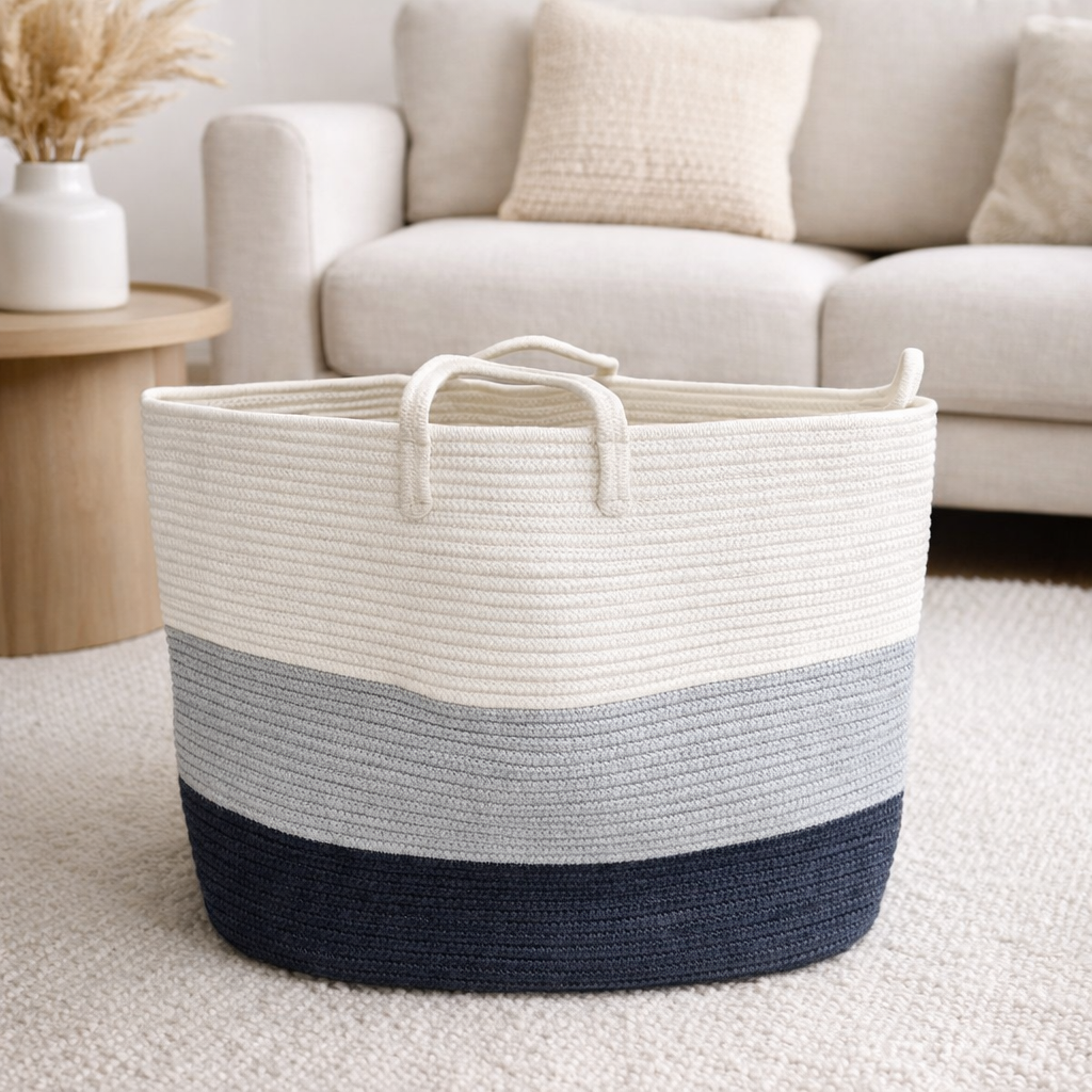 Canasto decorativo con diseño tricolor que suma personalidad al espacio. Ideal para guardar textiles, juguetes u objetos de uso diario. Incluye manijas para un traslado cómodo.