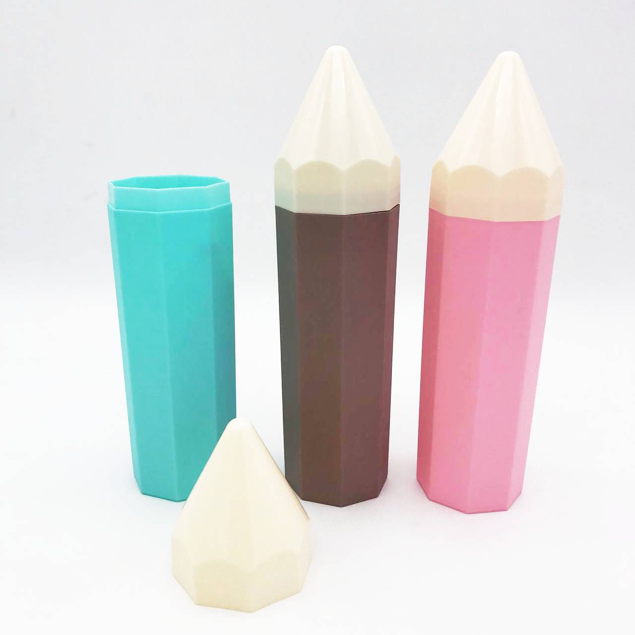 cartuchera con forma de lápiz, realizada en plástico resistente.