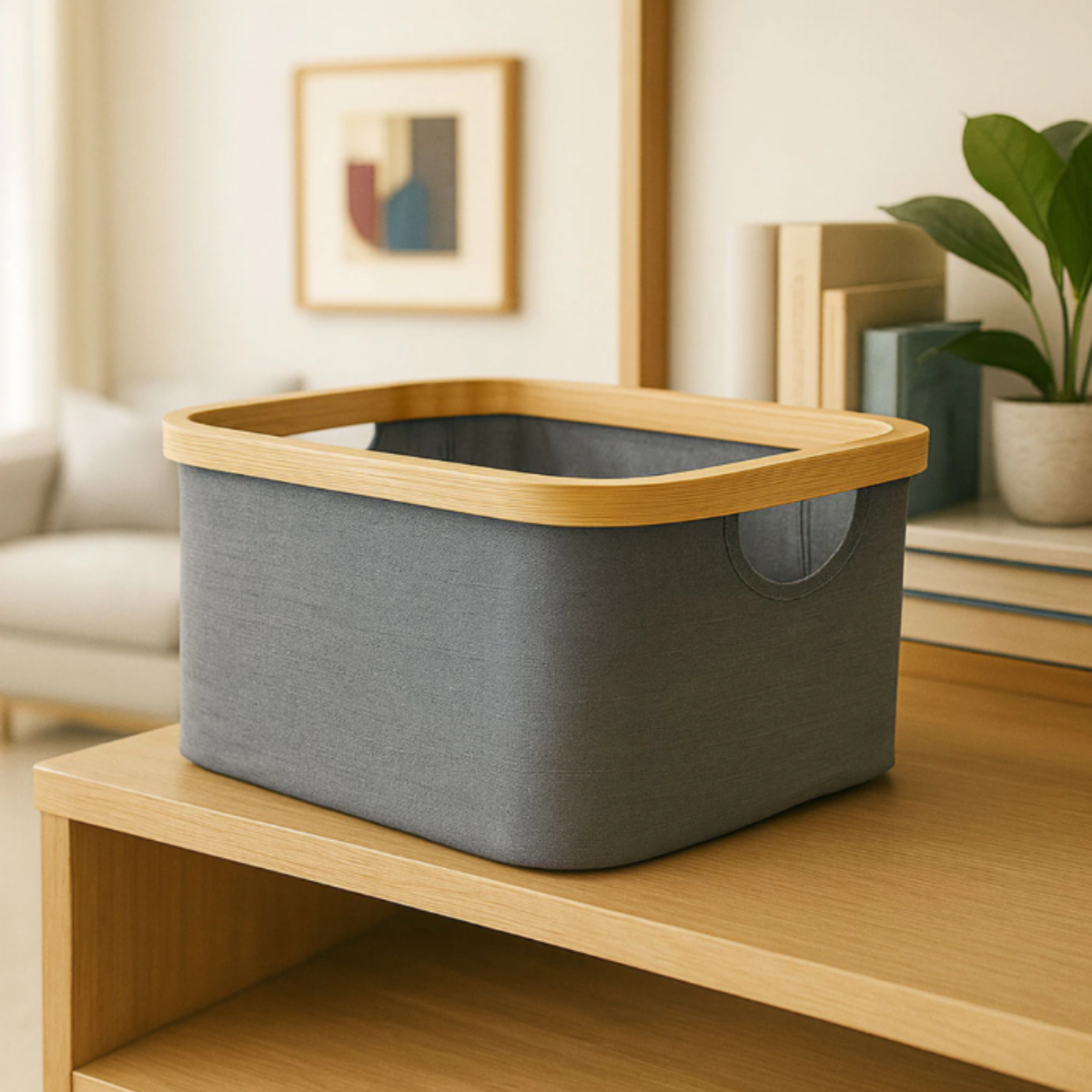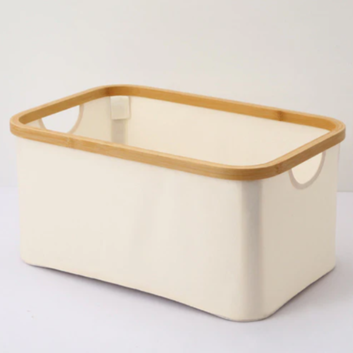Cesto plegable con borde de bambú. Ideal para organización del hogar.