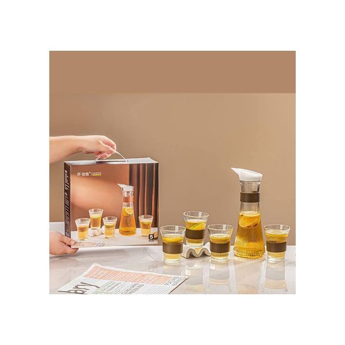 Los vasos a juego complementan la jarra, creando una presentación uniforme y elegante. Es un artículo común para el hogar, perfecto para el uso diario o para ocasiones especiales.