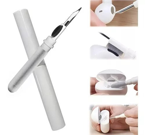 Herramienta de limpieza mulituso, ideal para auriculares, teclados y camaras. Es un lapiz que posee dos puntas, una con punta de metal y cepillo de alta densidad, y la otra punta con una esponja.