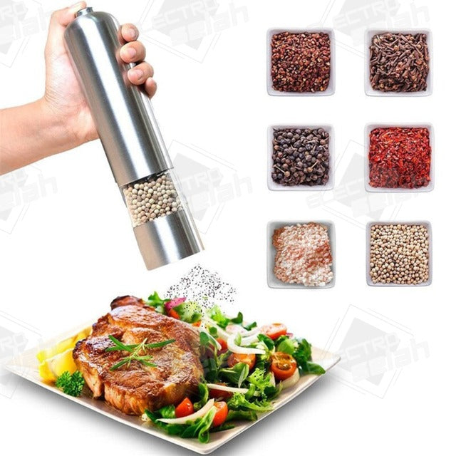 Molinillo automatico de sal y pimienta automatico. La tolva de acrílico transparente facilita la limpieza del molinillo de pimienta y permite al usuario controlar la cantidad de especias.