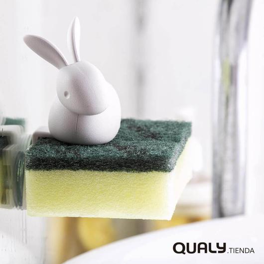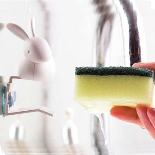 Porta esponja con diseño de conejo y esponja de cocina doble faz de regalo. Se coloca mediante dos sopapas en superficies lisas como el azulejo, espejo o vidrio, y la cabeza de conejo gira 360°C. Medidas aproximadas: 10 x 5 x 7 cm. Material: plástico. Color: blanco BTO X120