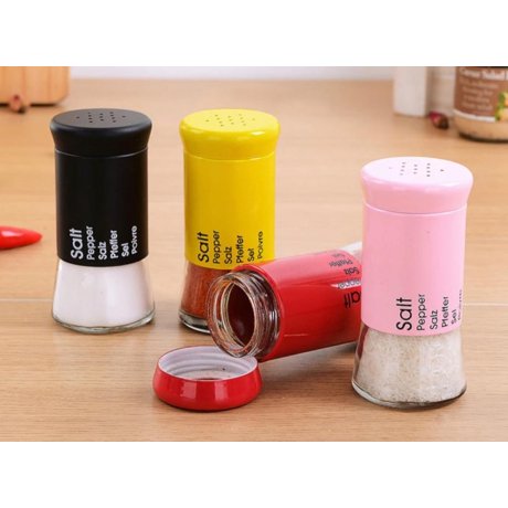 Salero de vidrio y metal. Util y decorativo. Medidas: 12 cm alto