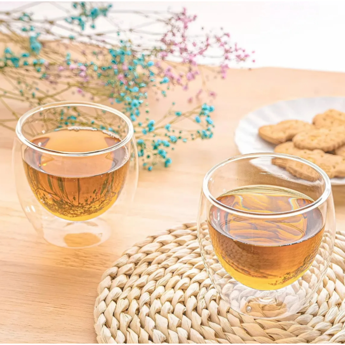 Set de 2 vasos de vidrio sin manija, con capacidad de 200 ml. Diseño moderno y minimalista, ideales para café, té o bebidas calientes.