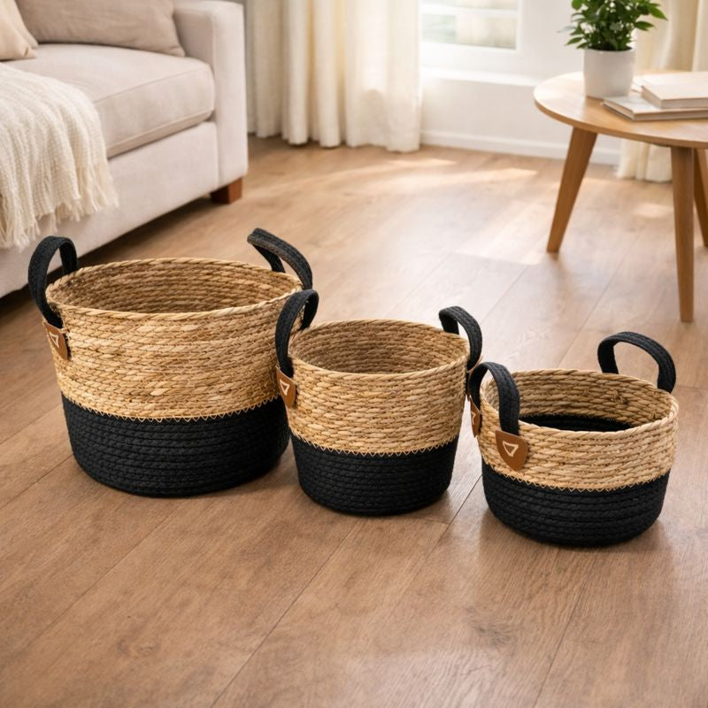 Set 3 Canastos de fibra natural y cuerda de algodón tejida.