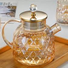 Tetera de vidrio con un diseño en relieve tipo diamante y una tapa dorada con un pomo decorativo de cristal